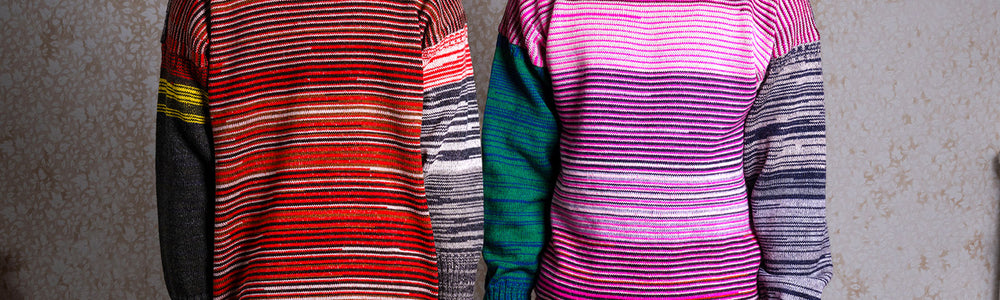 Discovered by chance when evaluating our waste & remnants, we found that our Head Technician has to occasionally "push" through a body or sleeve piece when coming to the end of a run. He uses only leftover yarn and the resulting knit is a glorious combination of multicoloured 100% British worsted wool. Each of our vintage flatbed machines is hand set and Ian meticulously sets and tests each size. It is no simple push of a button.